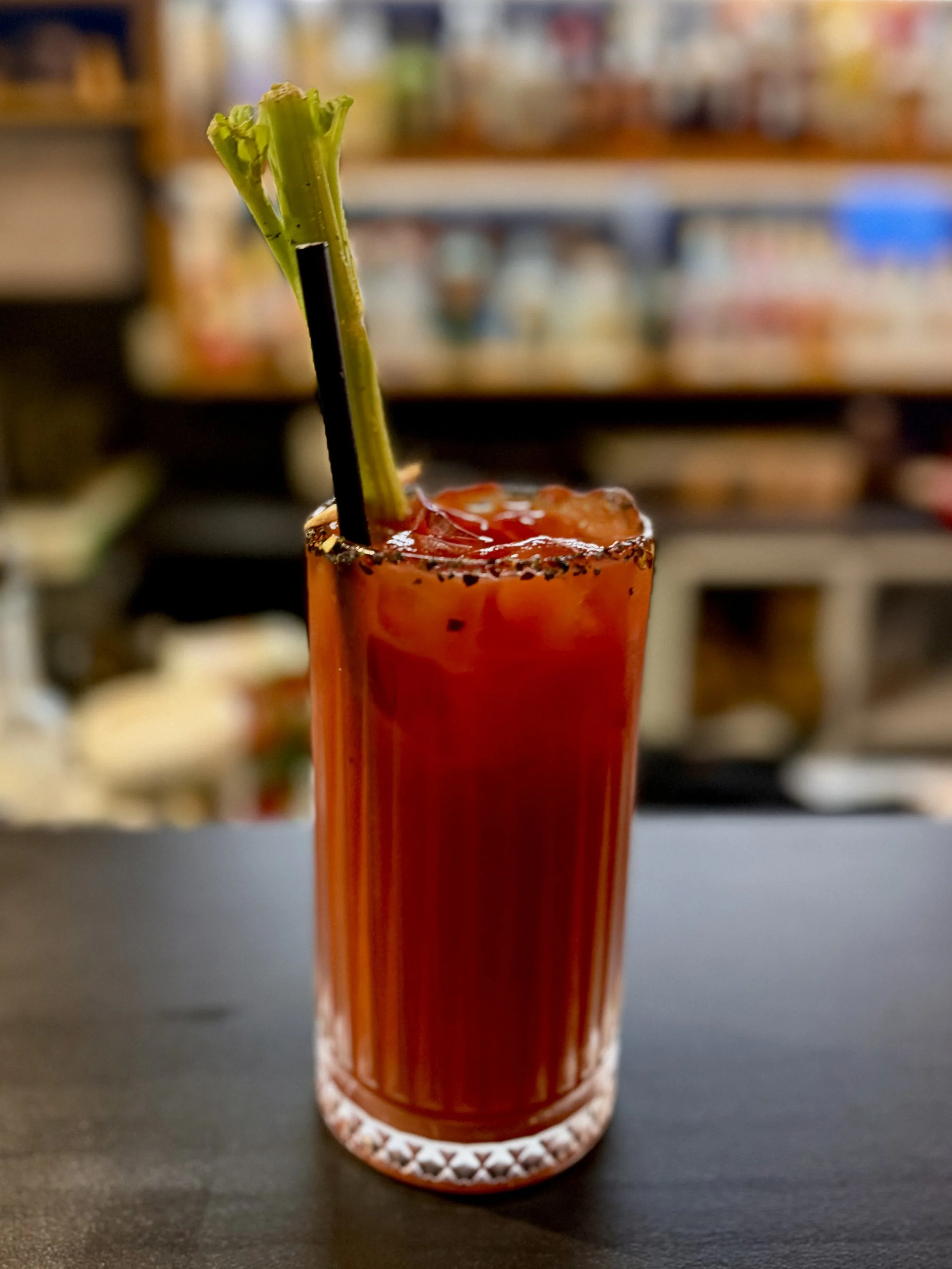 Our take on the Bloody Mary. Vodka, Tomato, Lemon, Worcestershire Sauce is combined then served in a tall glass, with a Chilli Charcoal Salt rim and a celery stick for garnish.